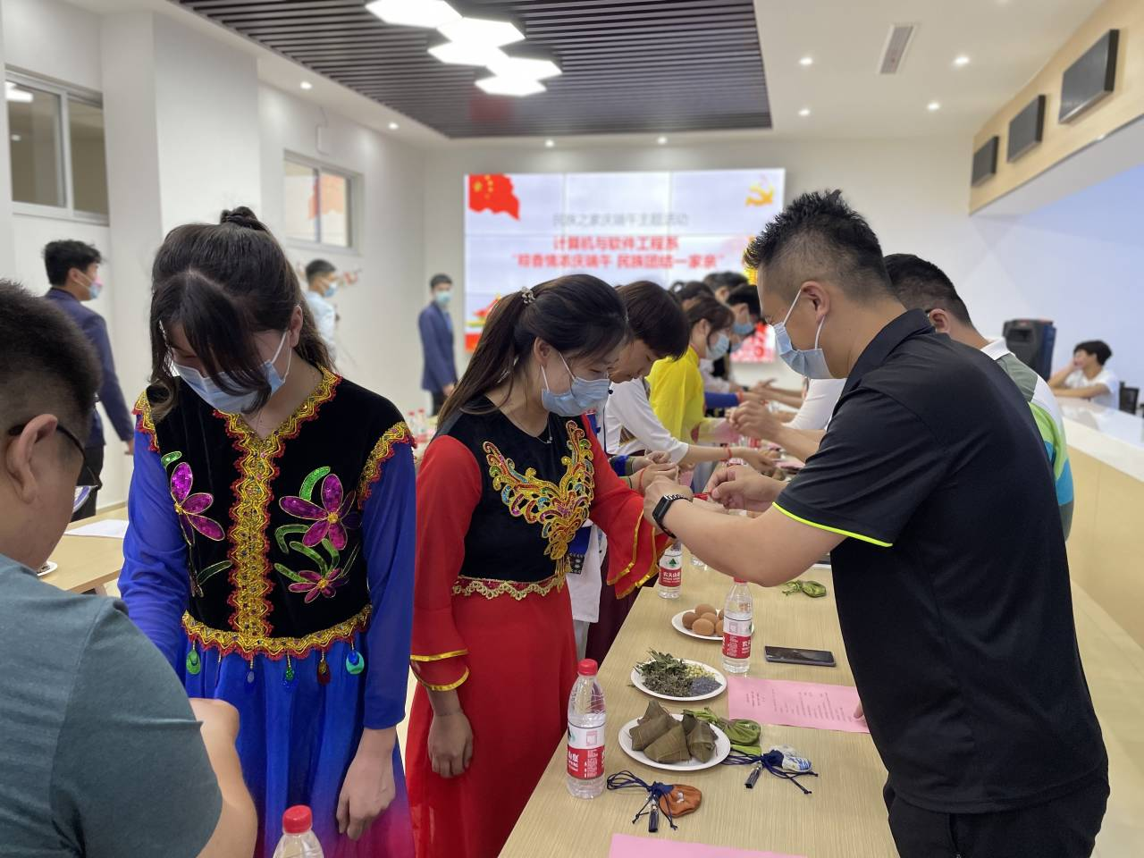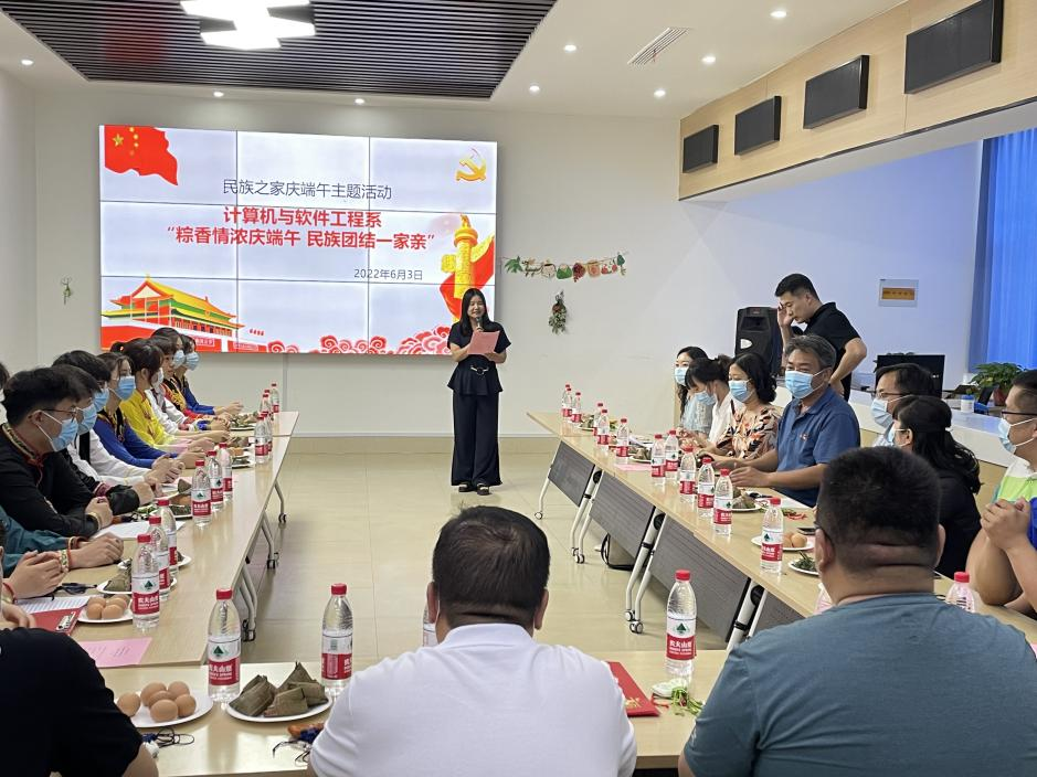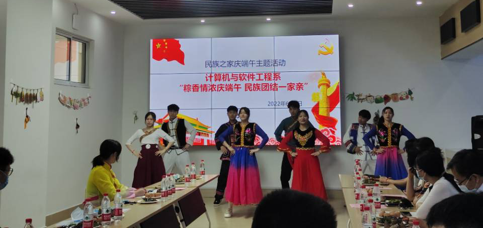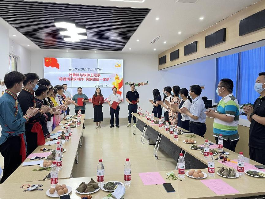 計(jì)算機(jī)與軟件工程系李海彬等五位輔導(dǎo)員代表,現(xiàn)場(chǎng)朗誦詩(shī)歌《沒有共產(chǎn)黨就沒有新中國(guó)》,鏗鏘有力神采飛揚(yáng),朗誦過后,現(xiàn)場(chǎng)師生自發(fā)起立齊聲合唱,將活動(dòng)推向了高潮。計(jì)算機(jī)與軟件工程系副主任任文娟為在場(chǎng)師生送上端午祝福后,發(fā)放了制作端午香囊的材料,讓大家共同感受傳統(tǒng)節(jié)日的魅力。