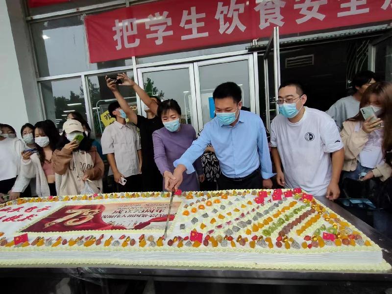 10月1日國慶節(jié),學校餐飲中心制作了一個長2米8,寬1米的大蛋糕,祝福祖國73周年華誕,在校值守的教職工與留校學生共同慶祝,祝偉大祖國生日快樂!