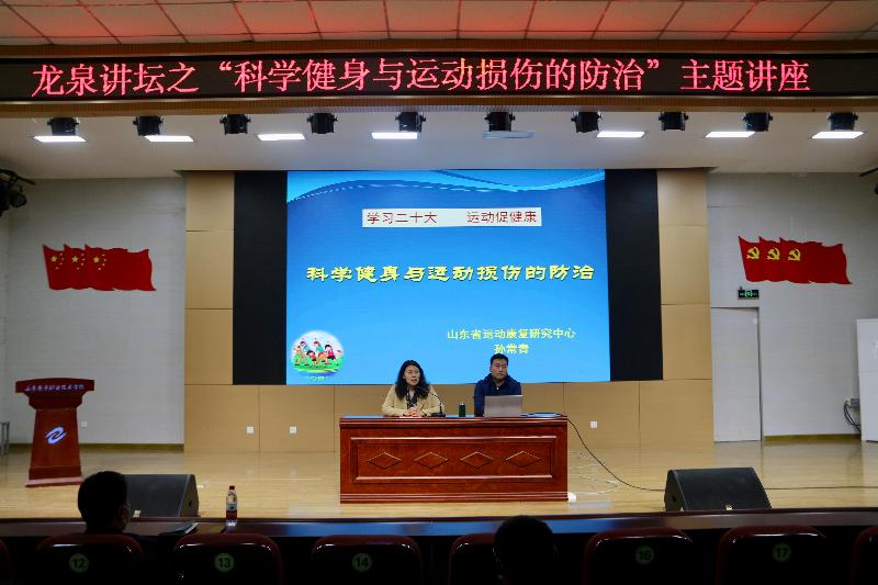 山東省運動康復研究中心(山東省體育醫(yī)院)康復醫(yī)學科主任孫常青擔任本次講座的主講人。孫常青主任分別從健康現(xiàn)狀調(diào)查、體育健身的功能分析、科學健身的原理和方法、常見運動損傷的防治四個方面切入此次講座的主題。首先通過健康現(xiàn)狀調(diào)查反映出我國居民在健康方面存在的嚴重問題——缺乏運動和體力活動。其次闡述了運動給身體帶來的好處,激發(fā)了學子們的運動興趣。然后,主講人運用簡單易懂的數(shù)學知識曲線圖和舉例子的方法來向同學們介紹了科學健身的兩大原理和五大方法。有效的科學健身方法可以從健康體適能、心血管適能、體脂率、肌肉適能、柔韌性等方面來增強學生們的體質(zhì)。最后,主講人分別針對運動損傷的三個時期來講解不同時期的處理原則和方式,并且?guī)ьI(lǐng)全場師生一起學習基本的頸肩疼痛預防的小妙招,通過寓教于樂的方式讓大家深深體會到科學健身的好處。