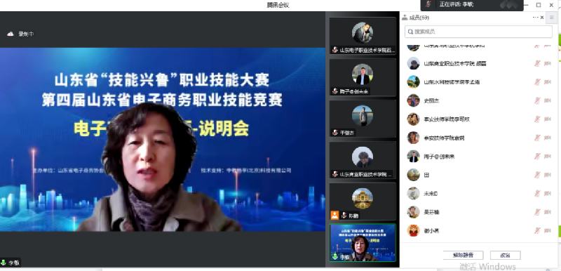 在大賽開(kāi)幕式上,山東省電子商務(wù)協(xié)會(huì)秘書長(zhǎng)于登杰首先致辭,他表示希望通過(guò)電子商務(wù)職業(yè)技能競(jìng)賽,實(shí)現(xiàn)以賽促學(xué)、以賽促練,為山東省數(shù)字經(jīng)濟(jì)發(fā)展和企業(yè)轉(zhuǎn)型升級(jí)提供高水平電子商務(wù)人才,促進(jìn)山東省電子商務(wù)產(chǎn)業(yè)高質(zhì)量發(fā)展。商務(wù)管理系主任李敏代表學(xué)校做賽務(wù)說(shuō)明,她介紹了我校電子商務(wù)專業(yè)發(fā)展取得的榮譽(yù)以及學(xué)校為本次比賽提供的人員支持和場(chǎng)地配置,期待參賽選手賽出水平,賽出風(fēng)格。技術(shù)方中教暢享(北京)科技有限公司專家陳鵬就競(jìng)賽規(guī)則、比賽實(shí)施、現(xiàn)場(chǎng)保障、競(jìng)賽須知等方面做了詳盡說(shuō)明。
