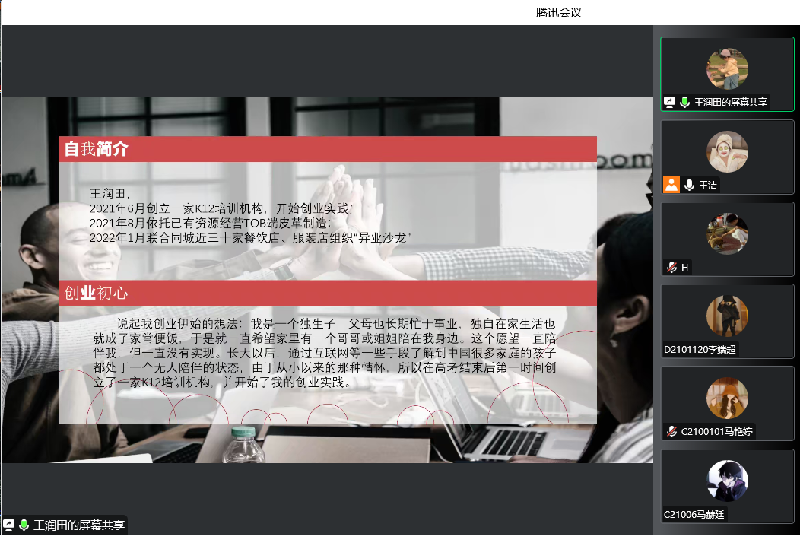 自媒體人高海濤同學(xué)分享到,他開朗外向的性格是促使他創(chuàng)業(yè)的原因之一,同時(shí)也想通過自己的努力讓自己和家人過上更幸福的生活,在抖音發(fā)展的如火如荼之時(shí)抓住機(jī)會(huì),開始帶貨;教育從業(yè)者王潤田同學(xué)談到,他的創(chuàng)業(yè)想法源自小時(shí)候的經(jīng)歷——“要是有個(gè)大哥哥大姐姐陪我長(zhǎng)大、陪我學(xué)習(xí)就好了”,于是在高考結(jié)束后成立了K12培訓(xùn)機(jī)構(gòu),開始創(chuàng)業(yè)實(shí)踐;助農(nóng)團(tuán)隊(duì)發(fā)起者楊長(zhǎng)數(shù)同學(xué)講到,第一書記黃文秀的先進(jìn)事跡鼓舞他要為鄉(xiāng)村做些事情,自身專業(yè)也使他對(duì)電商助農(nóng)有了認(rèn)識(shí),因此成立了“兩山沃土創(chuàng)業(yè)團(tuán)隊(duì)”。