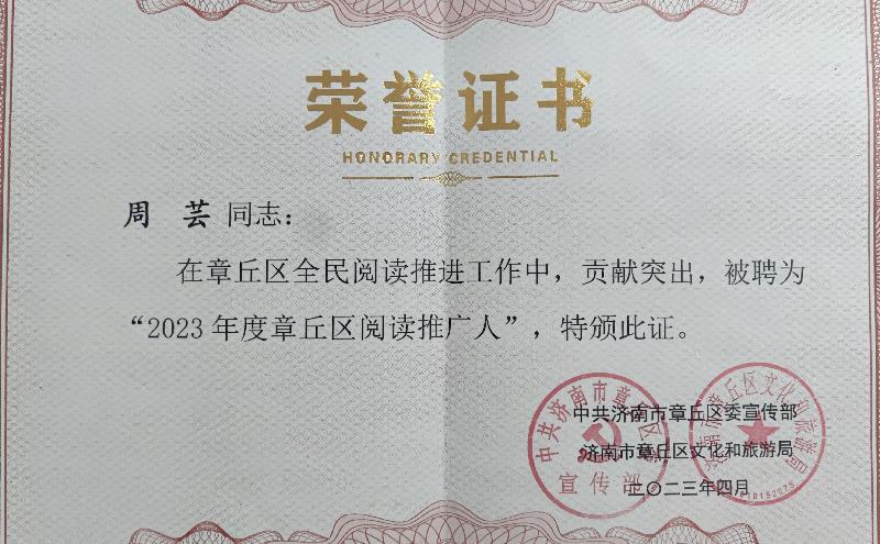 在第28個(gè)世界讀書日來(lái)臨之際,山東電子職業(yè)技術(shù)學(xué)院獲得章丘區(qū)委宣傳部和章丘區(qū)文旅局頒發(fā)的“全民閱讀特殊貢獻(xiàn)獎(jiǎng)”,商務(wù)管理系周蕓老師獲“閱讀推廣人”稱號(hào)。