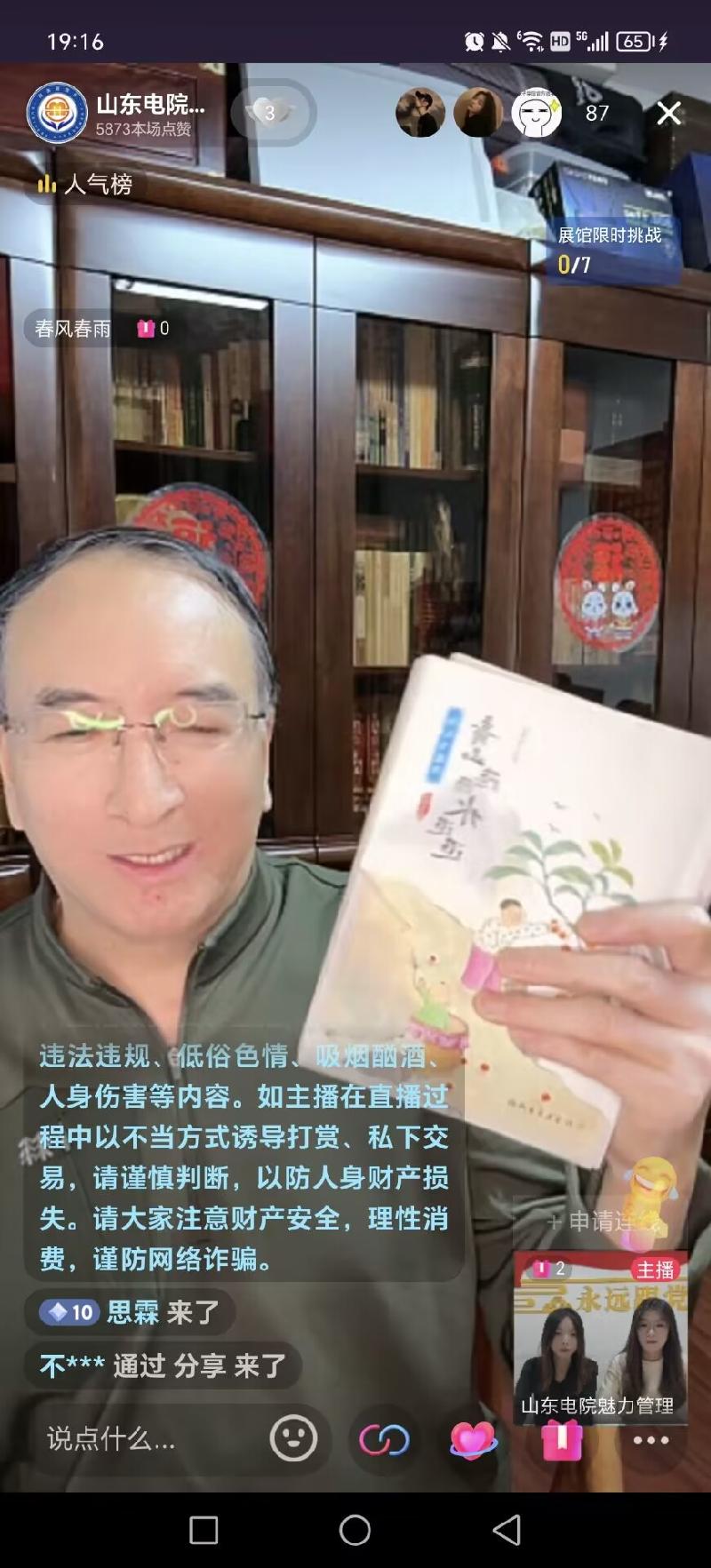 活動(dòng)中,商務(wù)管理系通過(guò)直播連線的方式與于欽良老師對(duì)話。于老師以重陽(yáng)佳節(jié)為契機(jī),為同學(xué)們推薦好書,分享經(jīng)驗(yàn),于老師教育同學(xué)們,知識(shí)之上是認(rèn)知,認(rèn)知之上是文化,文化之上是智慧,要用智慧解決問(wèn)題。同時(shí),要銘記讀書的四個(gè)境界:博覽群書,格物致知,學(xué)以致用,守正出奇,于老師鼓勵(lì)同學(xué)們?cè)诮?jīng)典中補(bǔ)充“營(yíng)養(yǎng)”,汲取勇氣、傳承精神,讓生命在閱讀中更加精彩,在閱讀中發(fā)散思維,在閱讀的過(guò)程中感受閱讀給予我們的力量。