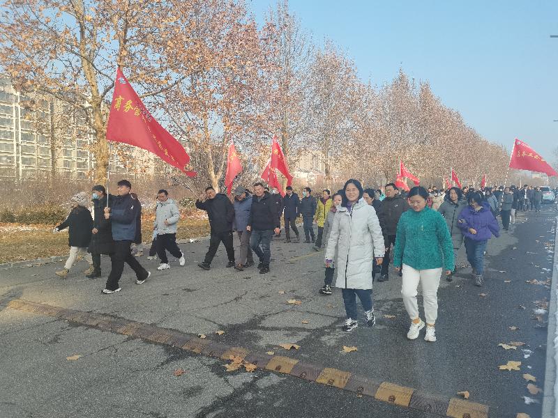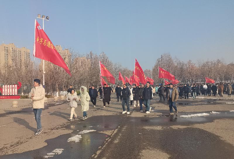 “砰”!隨著一聲槍響,健步走活動正式開始,教職工們熱情高漲、精神抖擻。在各分工會隊旗的指引下,大家按照指定路線前進(jìn),健步走的隊伍宛如一條游動的彩色長龍環(huán)繞著山電校園,成為山電一道亮麗的風(fēng)景線。在活動過程中,大家相互鼓勵、攜手共進(jìn),一邊呼吸雪后的清新空氣,一邊交流工作和生活,灑下一路歡聲笑語。