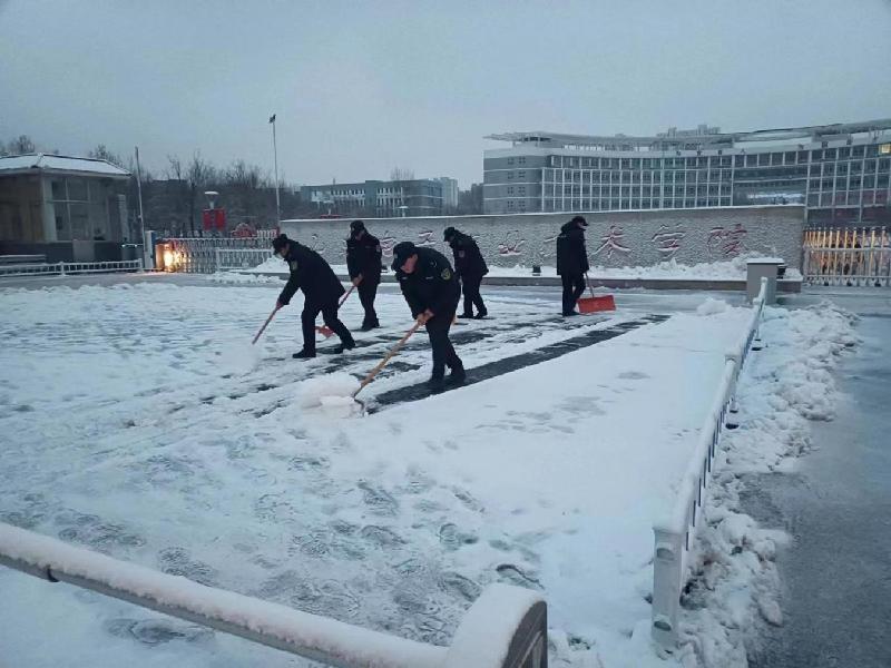 根據(jù)天氣預(yù)報(bào),本次降雪從12月14日持續(xù)至15日,雪量較大,安全保衛(wèi)處提前安排好掃雪人員和設(shè)備,重點(diǎn)做好道路、停車(chē)場(chǎng)等區(qū)域的積雪清掃和冰雪處理工作。