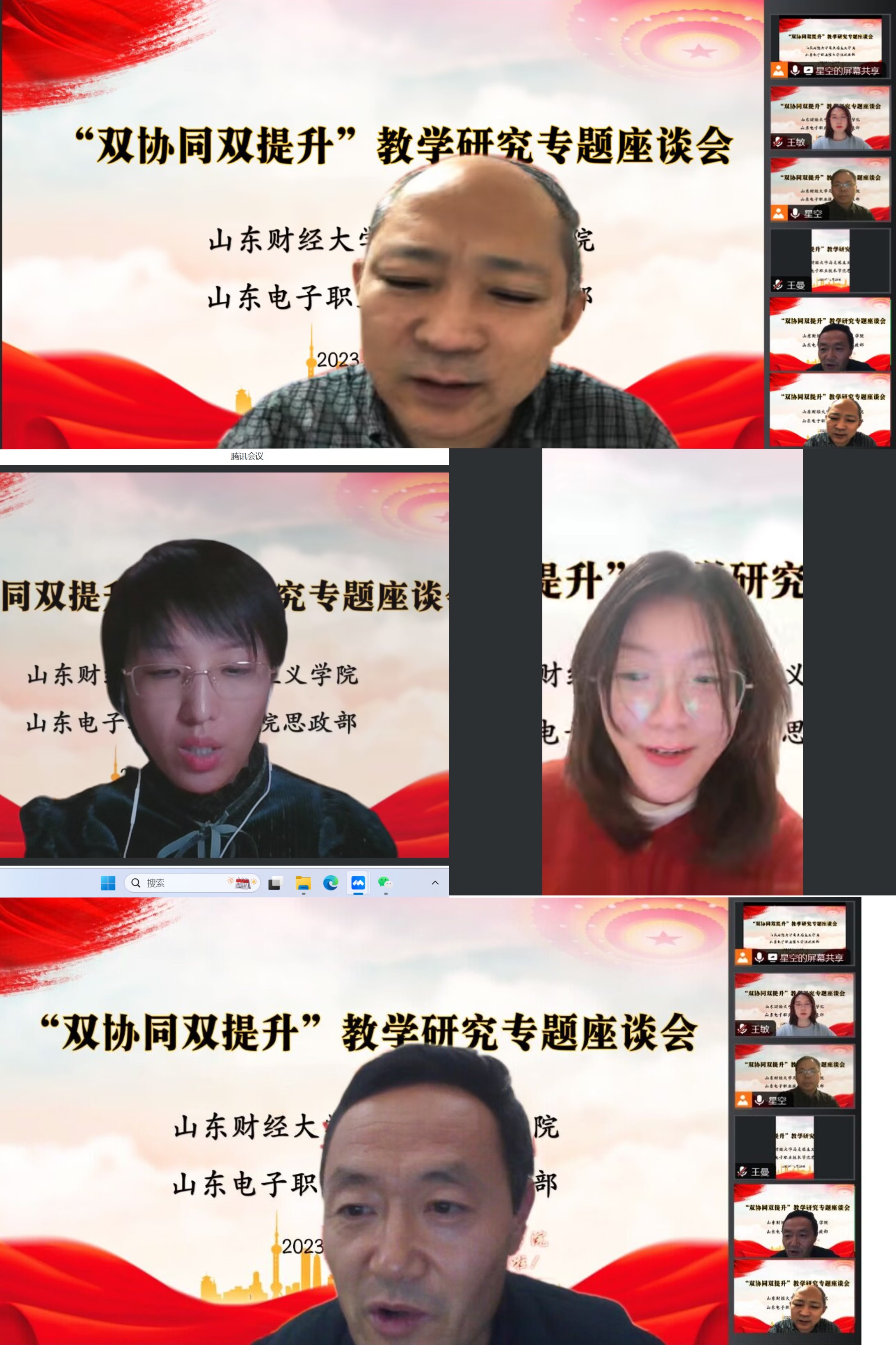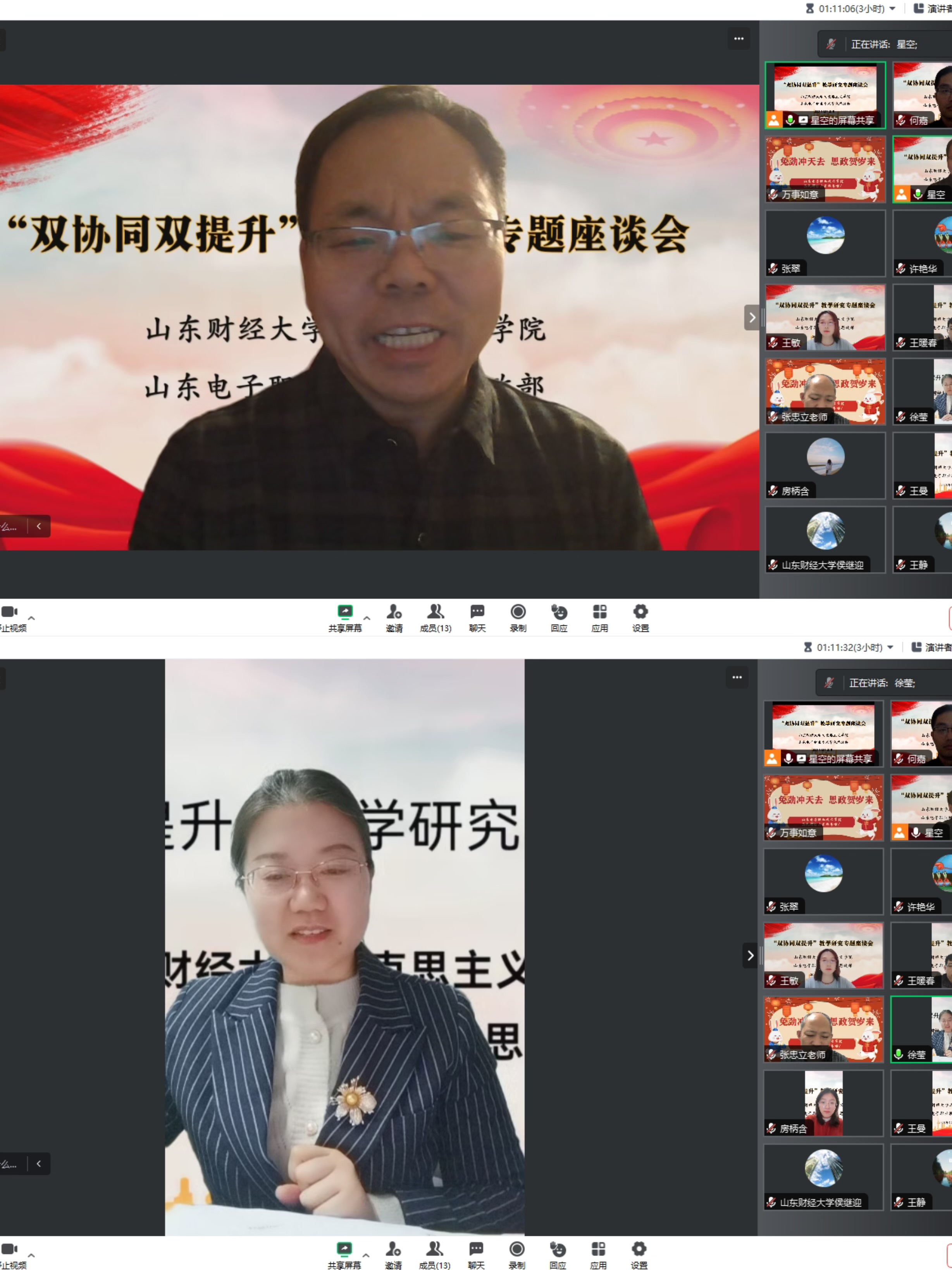為深入貫徹習(xí)近平總書記關(guān)于教育的重要論述特別是學(xué)校思政課教師座談會(huì)精神,認(rèn)真貫徹落實(shí)《山東省大中小學(xué)思政課“雙協(xié)同、雙提升”項(xiàng)目工作方案》的要求,我校思政部與山東財(cái)經(jīng)大學(xué)馬克思主義學(xué)院于12月28日聯(lián)合舉辦“雙協(xié)同、雙提升”教學(xué)研究專題座談會(huì)云端會(huì)議,我校思政部主任張同勝、山東財(cái)經(jīng)大學(xué)馬克思主義學(xué)院院長徐瑩等部門負(fù)責(zé)人,兩校思政課教研室主任及青年教師代表參加了座談會(huì)。會(huì)議由我校思政部主任張同勝主持。
