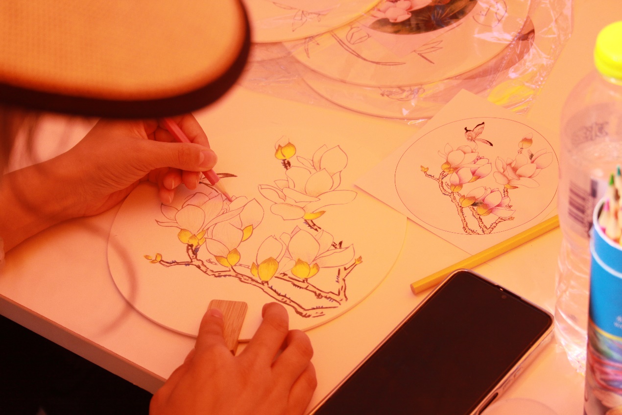 DIY團扇:在扇面上描繪出圖案的輪廓,然后進行上色和繪畫,幫助同學(xué)們緩解焦慮和壓力,促進身心健康。