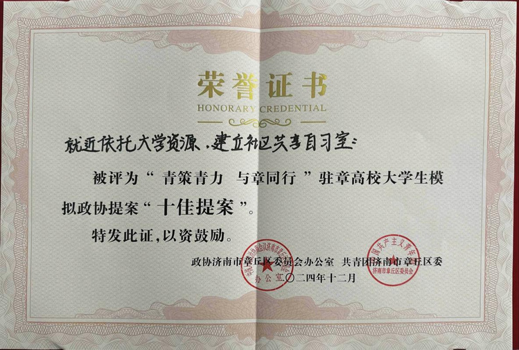 12月5日,我校趙宇真、王智燁同學(xué)參加章丘區(qū)政協(xié)、團章丘區(qū)委主辦的“青策青力 與章同行”駐章高校大學(xué)生模擬政協(xié)提案交流展示活動,經(jīng)過前期提案選題、撰寫打磨、現(xiàn)場展示等過程,我校選送的模擬政協(xié)提案《打造濟南章丘大學(xué)城IP地標,活躍大學(xué)周邊文化氛圍》《就近依托大學(xué)資源,建立社區(qū)共享自習(xí)室》獲得駐章高校大學(xué)生模擬政協(xié)提案“十佳提案”稱號。