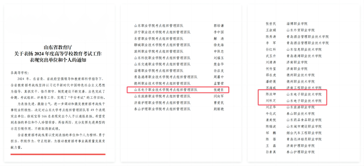近日,山東省教育廳發(fā)布《關(guān)于表?yè)P(yáng)2024年度高等學(xué)校教育考試工作表現(xiàn)突出單位和個(gè)人的通知》(魯教招函〔2024〕15號(hào)),對(duì)在2024年度高等學(xué)校教育考試工作中表現(xiàn)突出的單位和個(gè)人進(jìn)行了通報(bào)表?yè)P(yáng)。山東電子職業(yè)技術(shù)學(xué)院考點(diǎn)組織管理團(tuán)隊(duì)?wèi){借出色的團(tuán)隊(duì)協(xié)作、高效的執(zhí)行能力和嚴(yán)謹(jǐn)?shù)墓ぷ髯黠L(fēng),榮獲“山東省2024年度教育考試工作表現(xiàn)突出單位”榮譽(yù)稱號(hào);陳汝坤、劉秋芝兩位老師獲得“山東省2024年度教育考試工作表現(xiàn)突出個(gè)人”榮譽(yù)稱號(hào)。