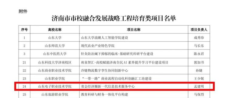 近日,濟(jì)南市教育局下發(fā)《關(guān)于公布濟(jì)南市校融合發(fā)展戰(zhàn)略工程培育類項(xiàng)目名單的通知》(市校融合2024-16號(hào)),我校孟建明老師牽頭申報(bào)的“省會(huì)經(jīng)濟(jì)圈新一代信息技術(shù)服務(wù)中心”項(xiàng)目成功入選。