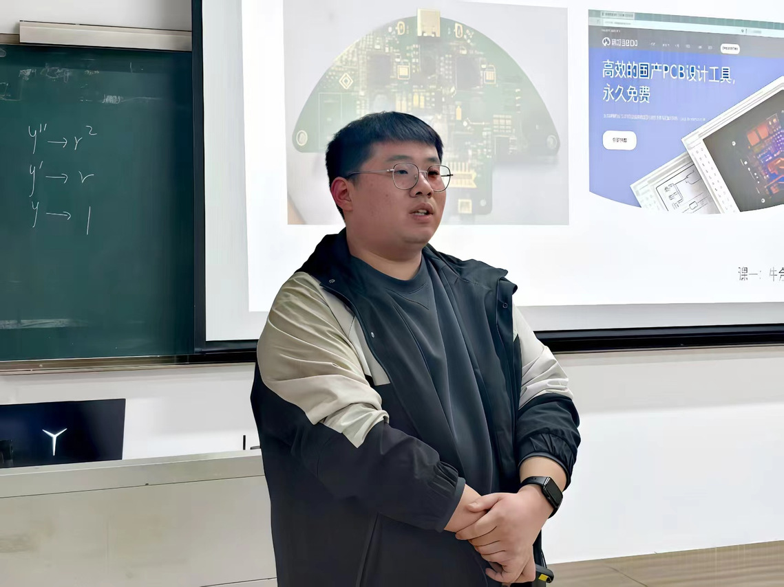 培訓現(xiàn)場,郝偉老師結合行業(yè)前沿案例闡述以項目帶動實踐的重要性,勉勵學子們:我們要把每個項目都視為攀登技術高峰的階梯,在實戰(zhàn)中錘煉真本領。牛余正同學結合自身的大賽參賽經(jīng)驗,重點演示嘉立創(chuàng)平臺操作規(guī)范、基礎器件識別方法及STM32最小系統(tǒng)板繪制流程。