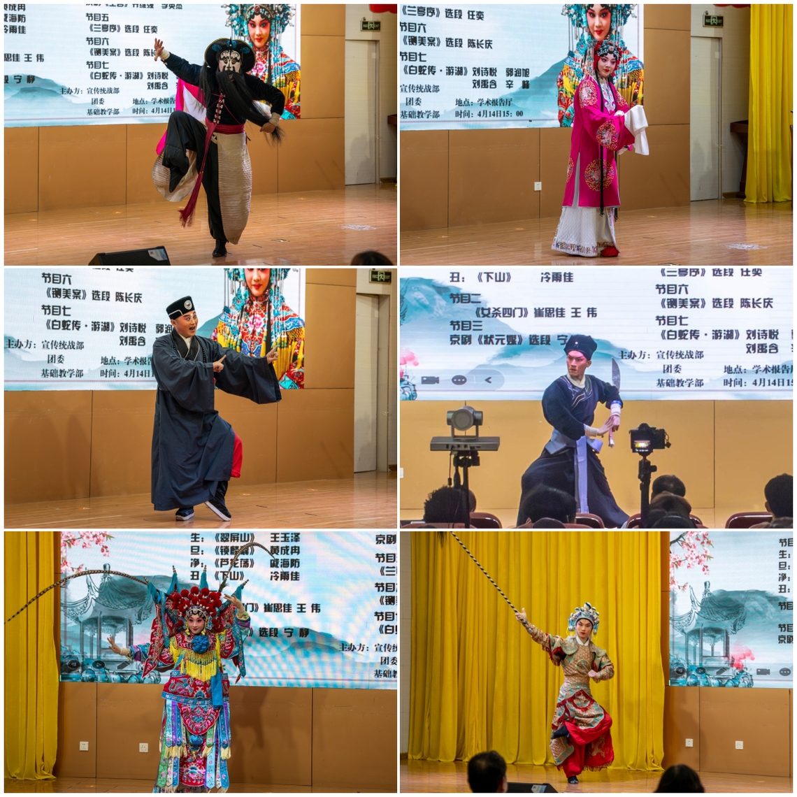 隨著一陣鏗鏘有力的鑼鼓聲響起,演出正式拉開(kāi)帷幕。經(jīng)典劇目亮點(diǎn)紛呈,生旦凈丑行當(dāng)齊全。舞臺(tái)上,武生身手矯健敏捷漂、率、脆,青衣端莊秀麗唱腔細(xì)膩,凈角眥目甩髯意態(tài)生動(dòng),丑角語(yǔ)言幽默動(dòng)作滑稽。觀眾時(shí)而在《女殺四門》中感受巾幗英雄的英勇氣概,時(shí)而在《坐宮》中感受四郎的思鄉(xiāng)與無(wú)奈,時(shí)而在《白蛇傳·游湖》中感受唯美動(dòng)人的愛(ài)情故事。裘派傳人陳長(zhǎng)慶老師的《鍘美案》唱段,聲如洪鐘、字正腔圓,一開(kāi)口更是技驚四座。藝術(shù)家們唱念做打技藝精湛,為師生呈現(xiàn)了一場(chǎng)視聽(tīng)盛宴。