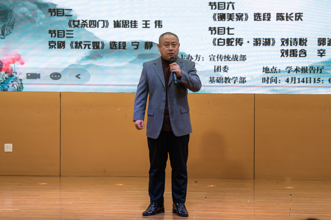 4月14日下午,山電學(xué)術(shù)報(bào)告廳內(nèi)鑼鼓鏗鏘、京韻悠揚(yáng),我校宣傳統(tǒng)戰(zhàn)部、團(tuán)委、基礎(chǔ)教學(xué)部與濟(jì)南市戲曲曲藝中心聯(lián)合舉辦的濟(jì)南市公益演出走基層“傳統(tǒng)文化進(jìn)校園”活動(dòng)精彩開(kāi)幕。學(xué)校張建臣院長(zhǎng),濟(jì)南市戲曲曲藝中心有關(guān)領(lǐng)導(dǎo),裘派傳人、京劇表演藝術(shù)家、國(guó)家一級(jí)演員陳長(zhǎng)慶老師等戲劇表演藝術(shù)家們與師生代表共同參加此次文化交流活動(dòng)。