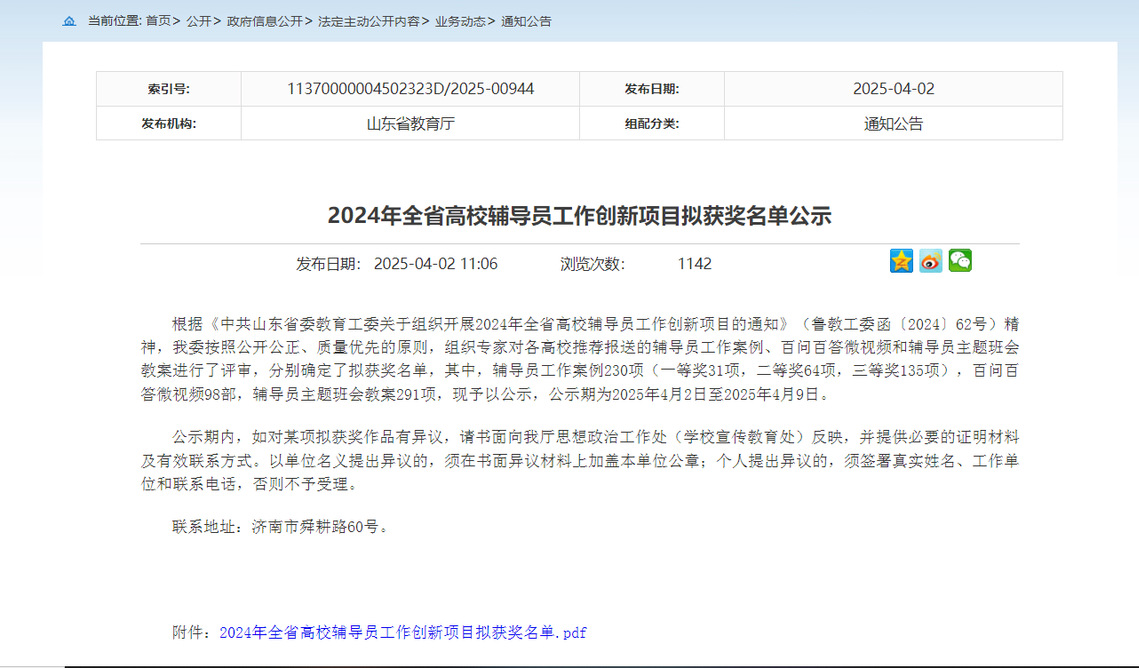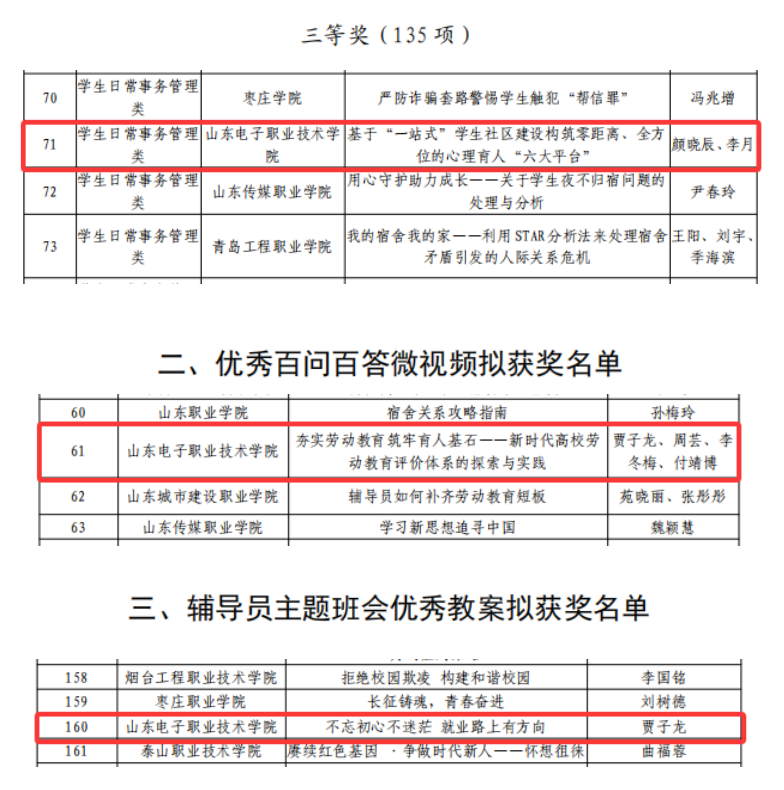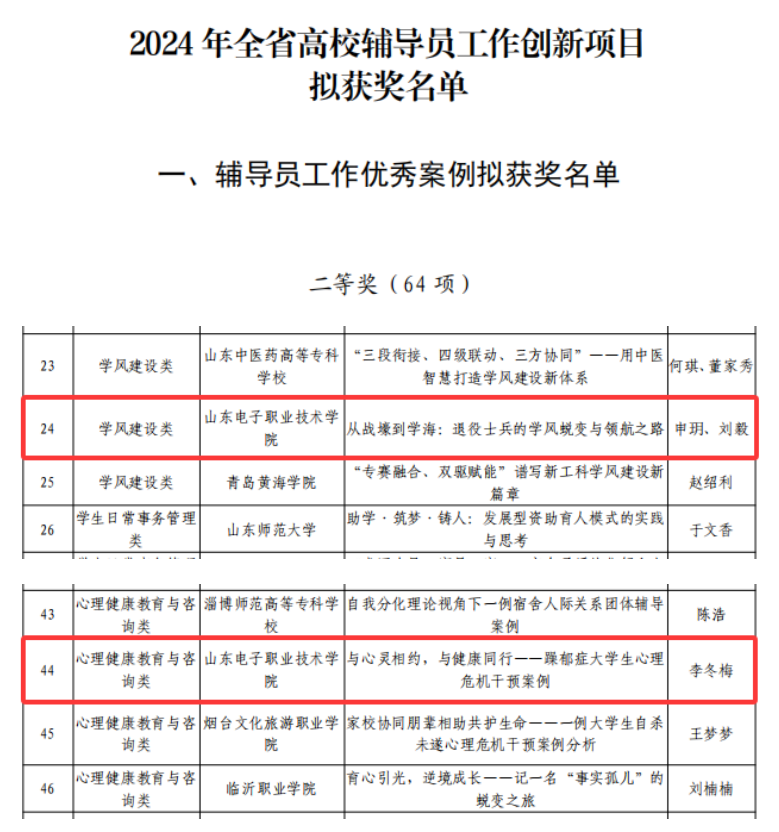 近日,在山東省教育廳(省委教育工委)發(fā)布的《2024年全省高校輔導(dǎo)員工作創(chuàng)新項(xiàng)目擬獲獎名單公示》中,我校5項(xiàng)作品獲獎,其中輔導(dǎo)員工作優(yōu)秀案例二等獎2項(xiàng)、 三等獎1項(xiàng),優(yōu)秀百問百答微視頻1項(xiàng),輔導(dǎo)員主題班會個人作品優(yōu)秀教案1項(xiàng)。