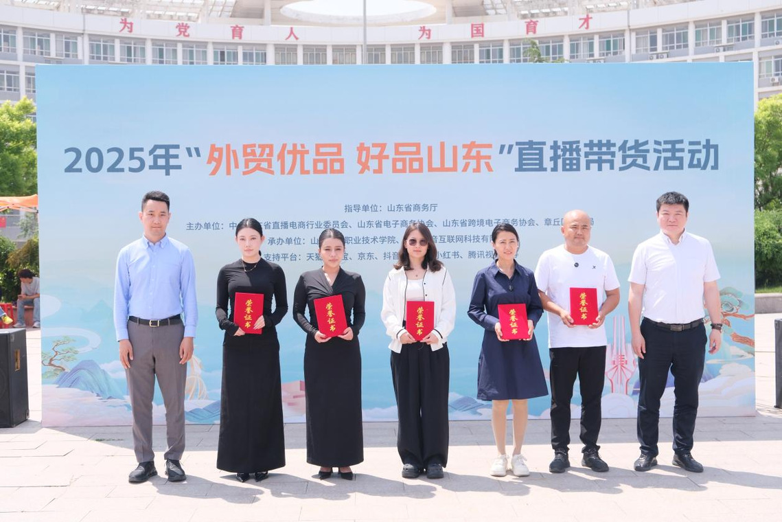 2025年5月15日,由山東省商務(wù)廳指導,中共山東省直播電商行業(yè)委員會、山東省電子商務(wù)協(xié)會、山東省跨境電子商務(wù)協(xié)會、章丘區(qū)商務(wù)局聯(lián)合主辦,我校與濟南潮音互聯(lián)網(wǎng)科技有限公司共同承辦的外貿(mào)優(yōu)品·好品山東直播帶貨進校園活動在校園廣場啟幕。本次活動獲得天貓、淘寶、京東、抖音、快手、小紅書、騰訊視頻號等電商平臺支持,吸引全省50余家優(yōu)質(zhì)企業(yè)攜外貿(mào)優(yōu)品、非遺老字號、特色工藝品參展,既為消費者呈現(xiàn)品質(zhì)盛宴,也為師生搭建了行業(yè)實踐平臺。