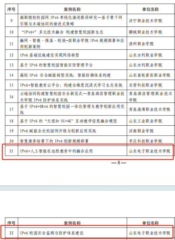 近日,山東省教育廳公布了山東省教育系統(tǒng)“IPv6/IPv6+”典型創(chuàng)新應(yīng)用案例評選結(jié)果,我校網(wǎng)絡(luò)信息中心牽頭編寫的《IPv6+人工智能在遠(yuǎn)程教育中的融合應(yīng)用》《IPv6 校園安全監(jiān)測與防護(hù)體系建設(shè)》兩個案例全部成功入選。