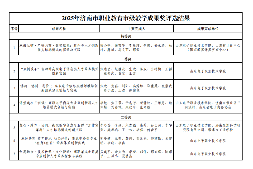 近日,濟(jì)南市教育局發(fā)布了2025年職業(yè)教育市級(jí)教學(xué)成果獎(jiǎng)評(píng)選結(jié)果,我校7項(xiàng)成果榜上有名。作為第一完成單位獲教學(xué)成果獎(jiǎng)特等獎(jiǎng)1項(xiàng)、一等獎(jiǎng)3項(xiàng)、二等獎(jiǎng)3項(xiàng),充分展現(xiàn)了學(xué)校教育教學(xué)改革成效和整體辦學(xué)實(shí)力的顯著提升。
