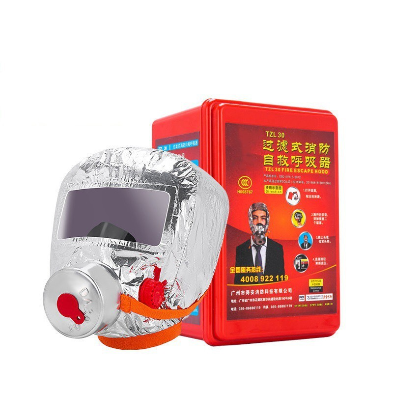 使用方法:當(dāng)發(fā)生火災(zāi)時,立即沿包裝盤開啟標(biāo)志方向打開盒蓋,撕開包裝袋取出呼吸裝置。沿著提醒帶繩拔掉前后兩個紅色的密封塞,將呼吸器套入頭部,向下拉至頸部,濾毒罐應(yīng)置于鼻子的前面。