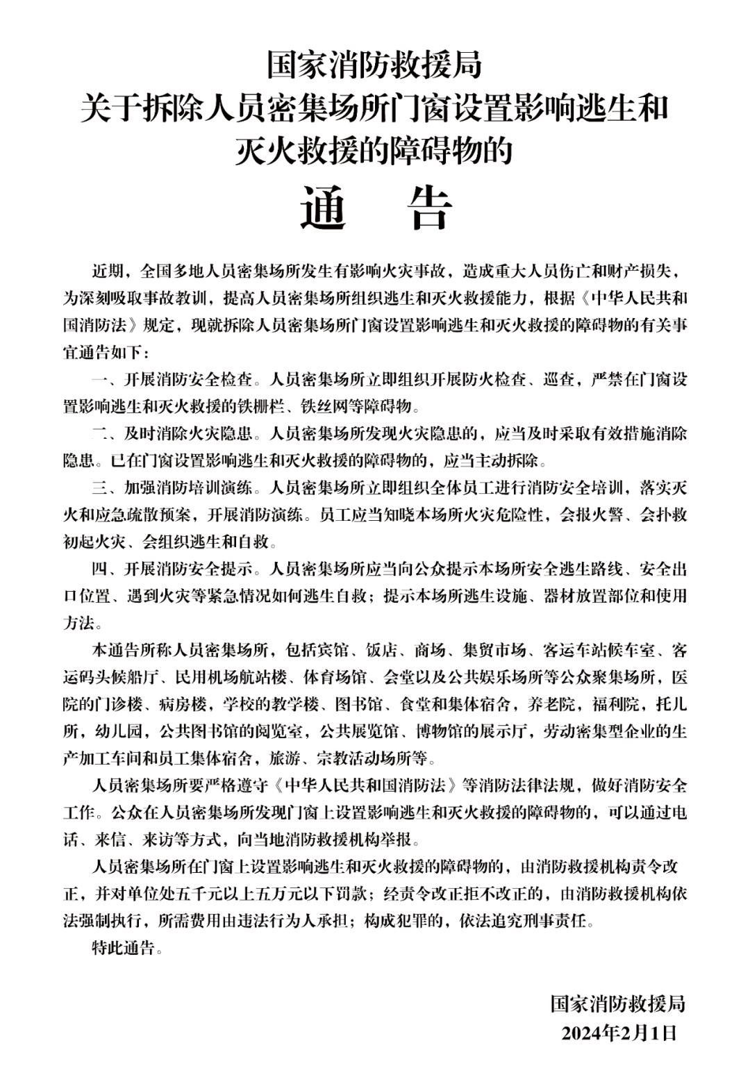 近期,全國(guó)多地人員密集場(chǎng)所發(fā)生有影響火災(zāi)事故,造成重大人員傷亡和財(cái)產(chǎn)損失,為深刻吸取事故教訓(xùn),提高人員密集場(chǎng)所組織逃生和滅火救援能力,根據(jù)《中華人民共和國(guó)消防法》規(guī)定,現(xiàn)就拆除人員密集場(chǎng)所門窗設(shè)置影響逃生和滅火救援的障礙物的有關(guān)事宜通告如下: