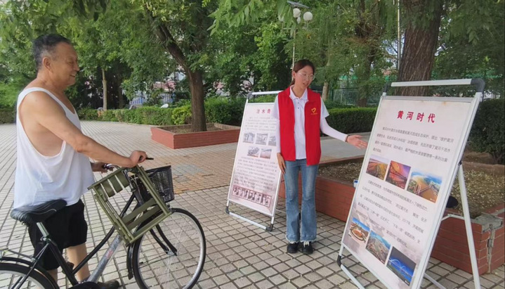 在此基礎(chǔ)上,實踐團(tuán)分赴兩地開展專題宣講。在楊廟社區(qū),以“黃河是中華民族的根與魂”為切入點,通過展板呈現(xiàn)黃河流域歷史脈絡(luò),解讀“母親河”孕育的文化瑰寶;同步結(jié)合《中華人民共和國黃河保護(hù)法》相關(guān)條款,用通俗語言解析法律要義,引導(dǎo)村民將文化認(rèn)同轉(zhuǎn)化為保護(hù)自覺。在桑園村,宣講立足“黃河文化與地方文脈共生”視角,依托古河道遺址與村史館,講述黃河流域農(nóng)耕文明對當(dāng)?shù)氐淖甜B(yǎng);針對《中華人民共和國黃河保護(hù)法》,重點解讀與農(nóng)業(yè)生產(chǎn)相關(guān)的條款,推動法治理念與文化自覺同頻共振,凝聚“守護(hù)母親河、傳承家鄉(xiāng)文脈”的共識。