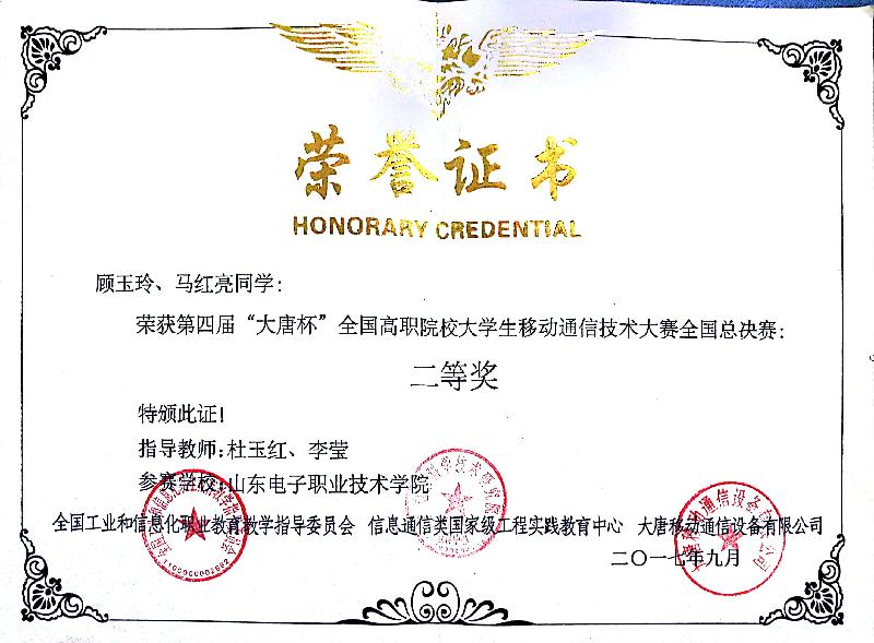 第四屆“大唐杯”全國(guó)高職院校大學(xué)生移動(dòng)通信技術(shù)大賽全國(guó)總決賽二等獎(jiǎng)