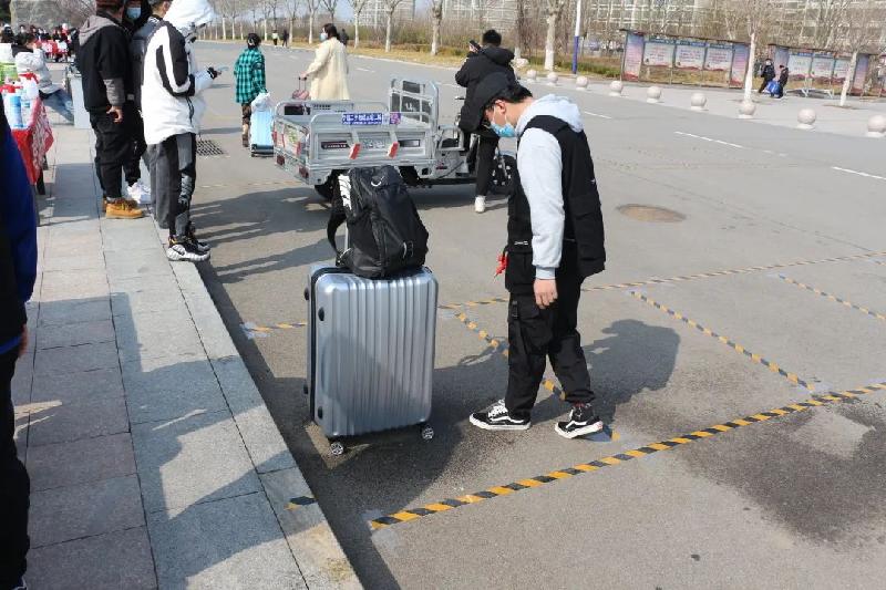 同學(xué)們告別了前來送別的家長,拖著行李箱走進(jìn)了熟悉的電院,門口是幫助同學(xué)們檢測(cè)體溫、核對(duì)健康碼以及搬運(yùn)行李的志愿者們。