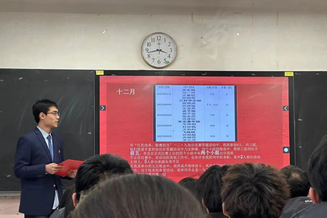 會議開始,李奕萱講解此次答辯的考核標(biāo)準(zhǔn),各班依照抽簽順序依次上臺進行答辯。各班準(zhǔn)備充分,在答辯過程中表現(xiàn)出色,圍繞班級組成,思想引領(lǐng),班級榮譽,文藝活動,素質(zhì)拓展,社會實踐等多個方面對“班團一體化”工作開展進行綜合匯報,匯報內(nèi)容詳實、邏輯清晰,極具班級特色,充分體現(xiàn)出各班的良好風(fēng)貌。