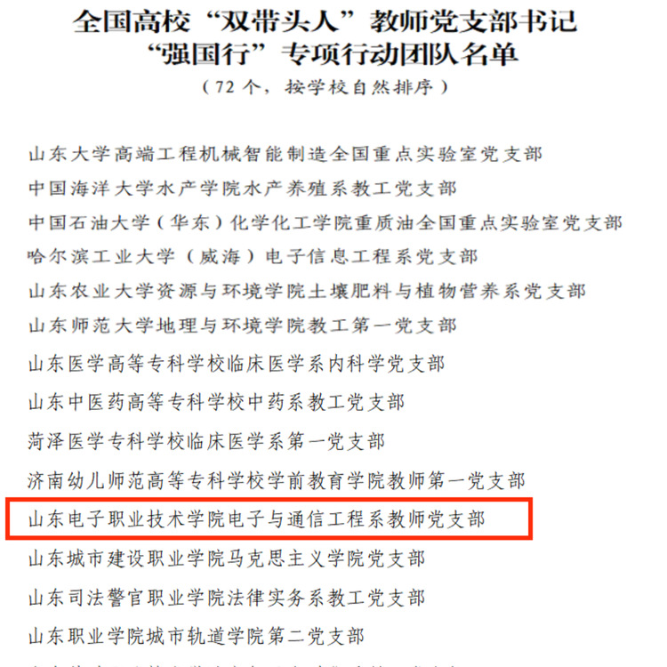 近日,省委教育工委發(fā)布《關(guān)于高校“雙帶頭人”教師黨支部書記“強國行”專項行動團隊遴選結(jié)果的公示》,我校電子與通信工程系教師黨支部成功入選全國高校“雙帶頭人”教師黨支部書記“強國行”專項行動團隊。