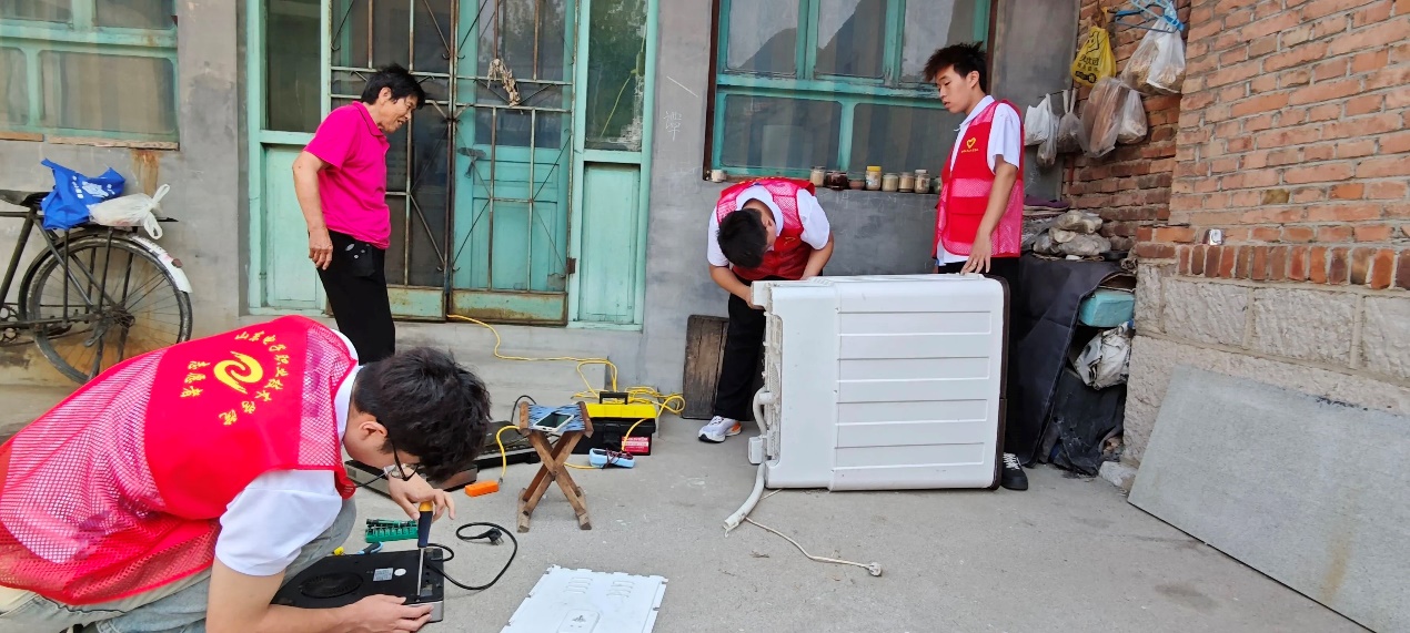 根據(jù)前期調(diào)研結(jié)果,隊(duì)員們分組走訪需要幫助的村民。維修過(guò)程中,隊(duì)員們認(rèn)真聽(tīng)取居民的需求,仔細(xì)檢查故障家電,運(yùn)用所學(xué)專業(yè)知識(shí)精準(zhǔn)維修。居民李大媽的洗衣機(jī)已放置多年未用,原本以為是機(jī)子老化損壞無(wú)法使用,隊(duì)員們仔細(xì)檢查后發(fā)現(xiàn)只是小故障,通過(guò)維修成功讓洗衣機(jī)“起死回生”。李大媽激動(dòng)地說(shuō):“這些孩子們真能干,真是幫了大忙了。”
