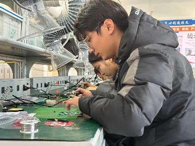 為確保大賽的專業(yè)性和公正性,由袁明波、辛顯榮、曹順霞、王鳳鳴、尹聰、郝偉、李文秀等老師組成評委團。大賽分為初賽和決賽,初賽主要考察選手對基礎(chǔ)焊接理論及技巧的掌握,通過初賽選出16名同學(xué)參加決賽;在決賽中,由師生組成的八組隊伍要在規(guī)定時間內(nèi)完成“福”字流水燈的電子電路焊接任務(wù),并確保電路能夠正常運行。比賽現(xiàn)場,選手們?nèi)褙炞⒌赝度氲胶附庸ぷ髦校瑢⒁粋€個微小的LED、芯片、電容精準地焊接在電路板上,展現(xiàn)出了極高的專注力和精湛的技藝,各組參賽老師指導(dǎo)學(xué)生識別電路圖、檢測元器件是否完好以及排除電路故障。