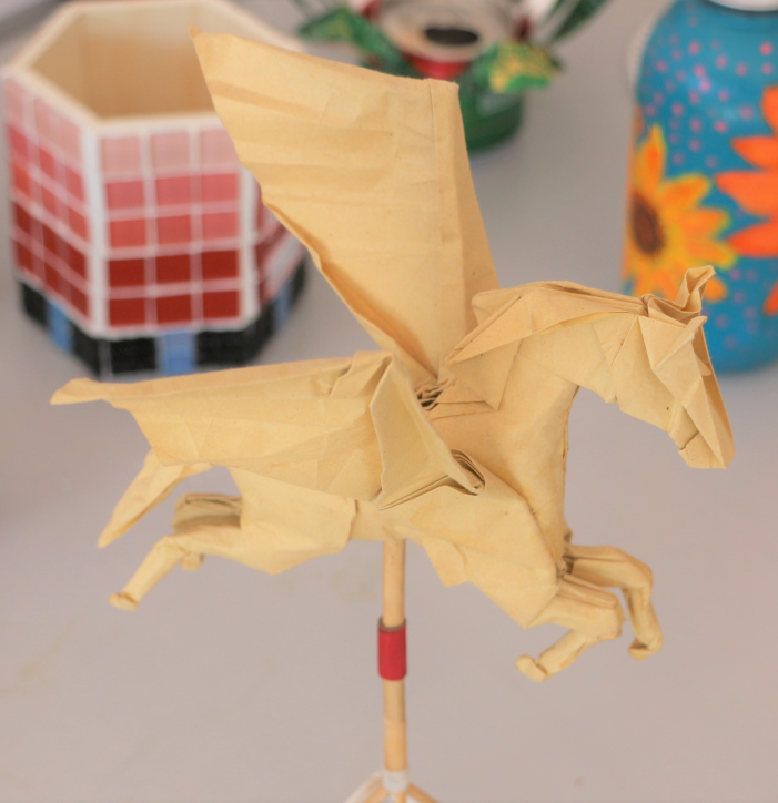 基礎(chǔ)教學(xué)部崔紅健老師用牛皮紙制作的飛馬擺件。