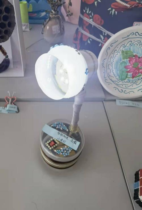 智能制造系的高霞老師利用專業(yè)技能用干果酸奶盒、控制電路和LED燈自制的小臺(tái)燈。