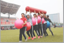 5名參賽者準(zhǔn)備好比賽器材(1號(hào)隊(duì)員抱1個(gè)瑜伽球,其他隊(duì)員手舉抱住柱子舉過(guò)頭頂,參賽者之間抵住一個(gè)瑜伽球)在起跑線后做好準(zhǔn)備。賽程40米,通過(guò)協(xié)力配合向終點(diǎn)行進(jìn),用時(shí)少者名次列前。