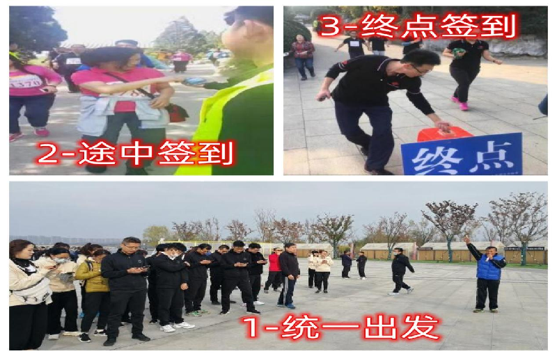 統(tǒng)一出發(fā)(無需打卡)→途中打卡處打卡簽到3次(必須簽到)→終點處打卡簽到1次,完成比賽→交回計時芯片,比賽完成。