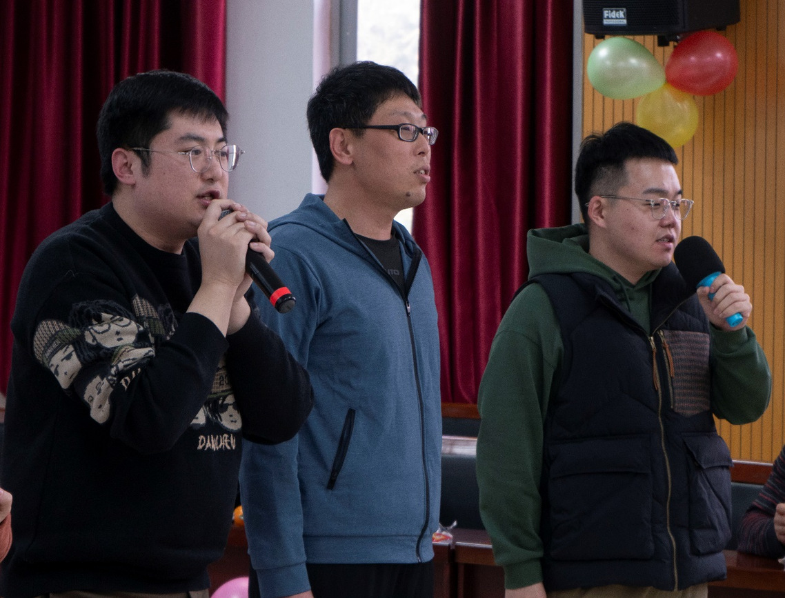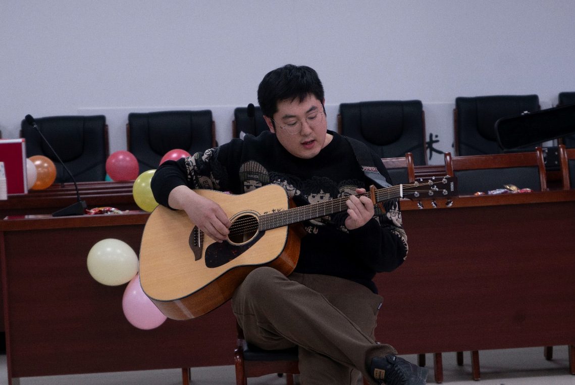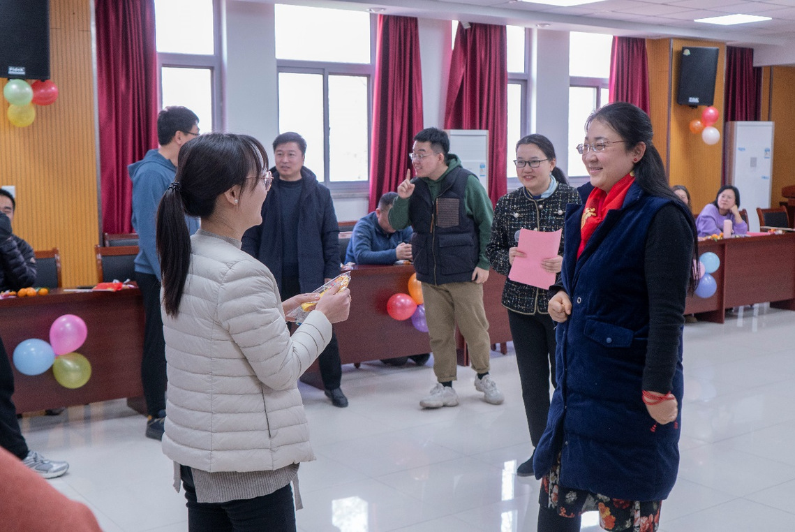 聯歡會在歡快的舞蹈《我最紅》中拉開序幕。整場聯歡會內容豐富,形式多樣,精彩紛呈;各個分工會的老師紛紛登場,一展身手。小合唱《金梭和銀梭》、吉他彈唱《風吹麥浪》、《三句半》、英韓日三國語言朗誦、女生獨唱、歌曲串燒等節(jié)目接連上演,不時贏得臺下觀眾的陣陣掌聲;趣味小游戲和幸運抽獎環(huán)節(jié)穿插進行。最后,聯歡會在歌曲《相親相愛一家人》中落下帷幕。