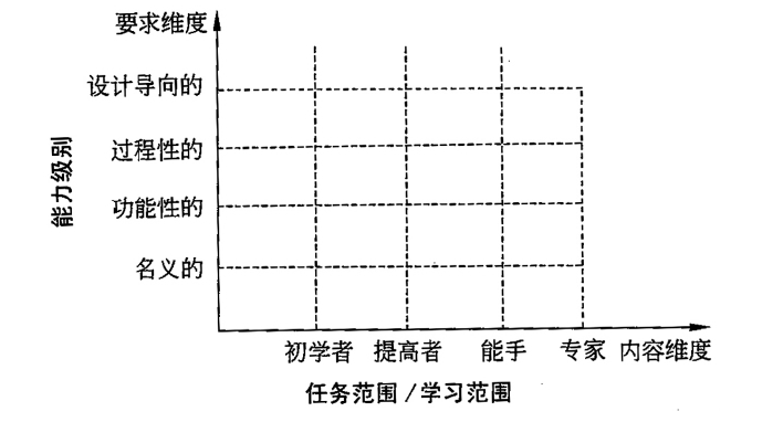 在KOMET測評(píng)技術(shù)中,能力級(jí)別的劃分是保持最終測評(píng)公平公正性的基礎(chǔ),能力級(jí)別表現(xiàn)出來的標(biāo)準(zhǔn)反應(yīng)在“能力值”上,能力值越大,其代表的能力水平就越高。KOMET測評(píng)技術(shù)的開發(fā)者將職業(yè)教育能力級(jí)別劃分了名義能力、功能性能力、過程性能力和整體化的設(shè)計(jì)能力這四個(gè)方面,與之適配的能力階梯則分別對(duì)應(yīng)初學(xué)者、提高者、能手和專家四個(gè)層次。KOMET測評(píng)技術(shù)二維職業(yè)能力模型圖如圖1所示: