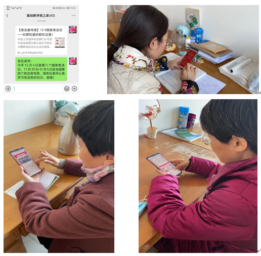 基礎(chǔ)教學(xué)部在部門群內(nèi)上傳憲法相關(guān)知識和視頻,教職工通過網(wǎng)絡(luò)進(jìn)行學(xué)習(xí)和收看,并將收看實(shí)況拍照上傳。