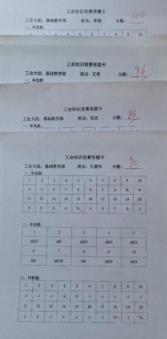 基礎(chǔ)教學(xué)部教職工認(rèn)真對待本次答題活動,在職職工39人參加,工會大組長將答題卡打印,逐份批改,并將批改后的試卷拍照整理。