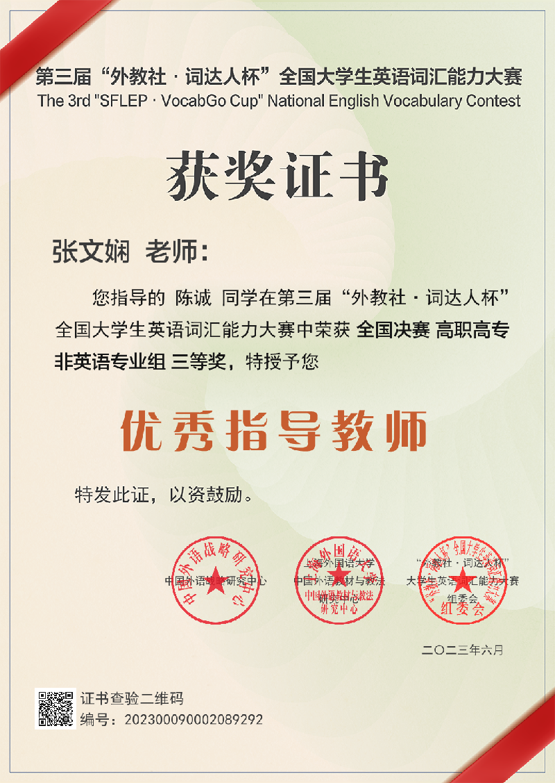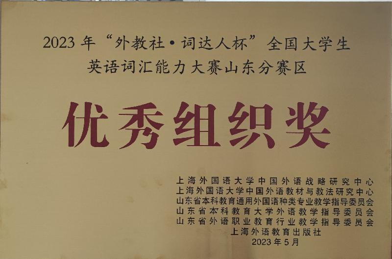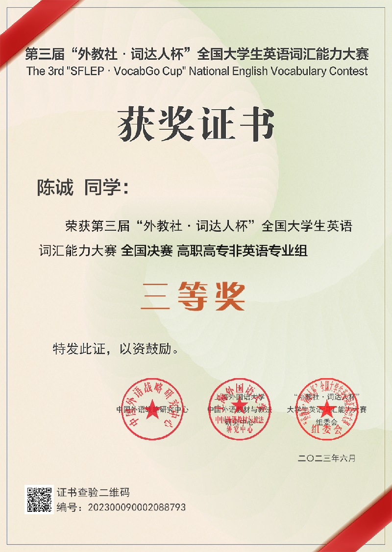 近日,第三屆“外教社·詞達(dá)人杯”全國(guó)大學(xué)生英語(yǔ)詞匯能力大賽成績(jī)揭曉,山東電子職業(yè)技術(shù)學(xué)院計(jì)算機(jī)與軟件工程系2020級(jí)李先愛(ài)和財(cái)經(jīng)金融系2022級(jí)陳誠(chéng)分獲國(guó)賽二等獎(jiǎng)和三等獎(jiǎng),再創(chuàng)競(jìng)賽成績(jī)歷史新高,基礎(chǔ)教學(xué)部張永美和張文嫻兩位老師獲優(yōu)秀指導(dǎo)教師獎(jiǎng),學(xué)校獲優(yōu)秀組織獎(jiǎng)。