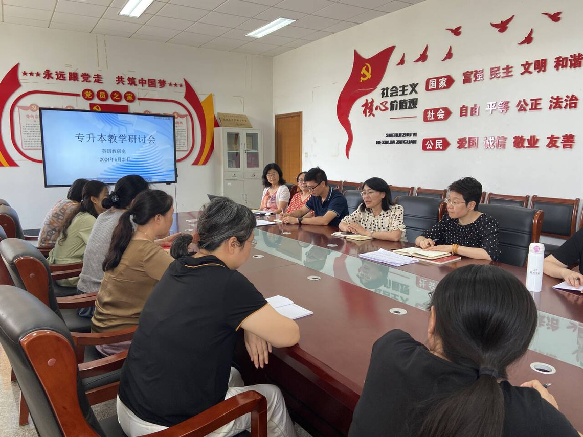 為科學安排新學期專本貫通班英語教學任務,進一步提升英語課教學質(zhì)量,更好地滿足同學們在專升本英語方面的學習需求,基礎教學部于6月26日召開專題英語教學研討會,探討和規(guī)劃新學期英語專升本教學的組織開展工作,本次會議由基礎教學部主任任文娟主持。