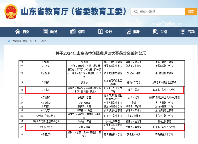 誦讀古今經(jīng)典,弘揚(yáng)中國(guó)精神。近日,省教育廳官網(wǎng)發(fā)布《關(guān)于2024年山東省中華經(jīng)典誦讀大賽獲獎(jiǎng)名單的公示》,我校首次選送的兩個(gè)參賽作品康燕、吳杰指導(dǎo)的《不朽》,張雅迪、崔紅健指導(dǎo)的《詩(shī)意中國(guó)》均獲得三等獎(jiǎng)。