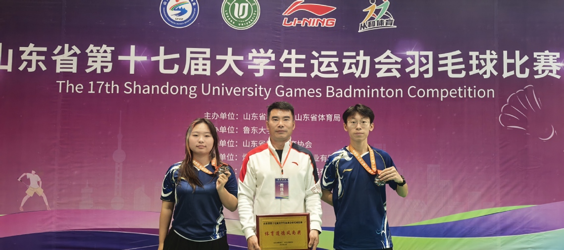 11月12日,山東省第十七屆大學生運動會羽毛球比賽(乙組)成績揭曉,我校數(shù)字商務學院學生張慶松、滕子躍在基礎教學部體育團隊指導下,由王清華老師帶隊參加比賽,歷經(jīng)六天賽程的激烈比拼,取得混雙比賽銅牌、男子單打第四的好成績,我校代表隊喜獲“體育道德風尚獎”!