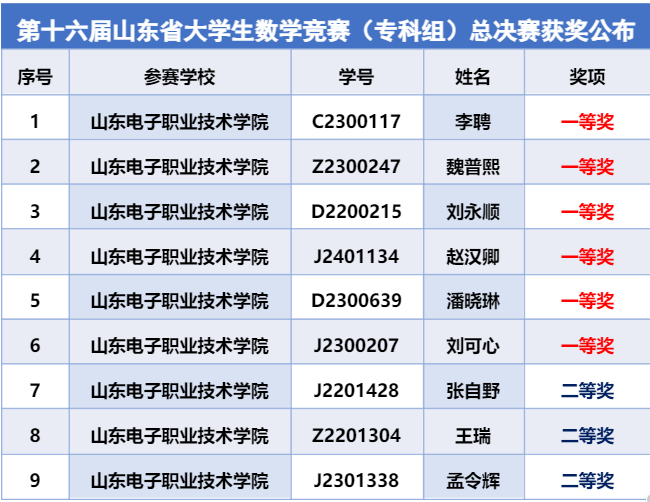 近日,第十六屆山東省大學(xué)生數(shù)學(xué)競(jìng)賽(專科組)總決賽在山東職業(yè)學(xué)院圓滿落幕。山東電子職業(yè)技術(shù)學(xué)院學(xué)子表現(xiàn)優(yōu)異,在此次競(jìng)賽中斬獲6個(gè)一等獎(jiǎng)、3個(gè)二等獎(jiǎng),展現(xiàn)出了扎實(shí)的數(shù)學(xué)功底和出色的競(jìng)賽能力。獲獎(jiǎng)學(xué)生名單如下: