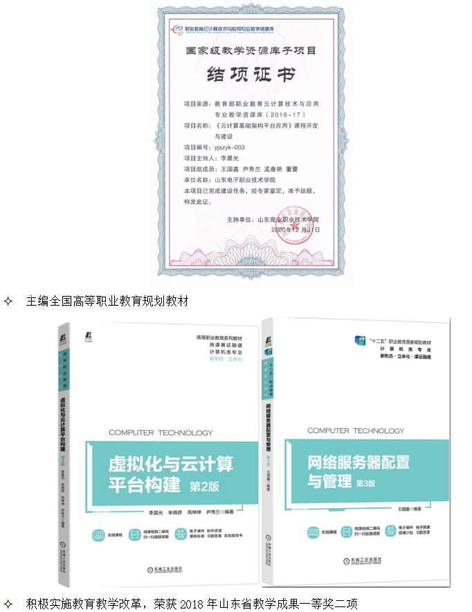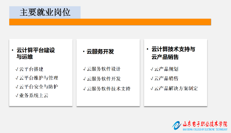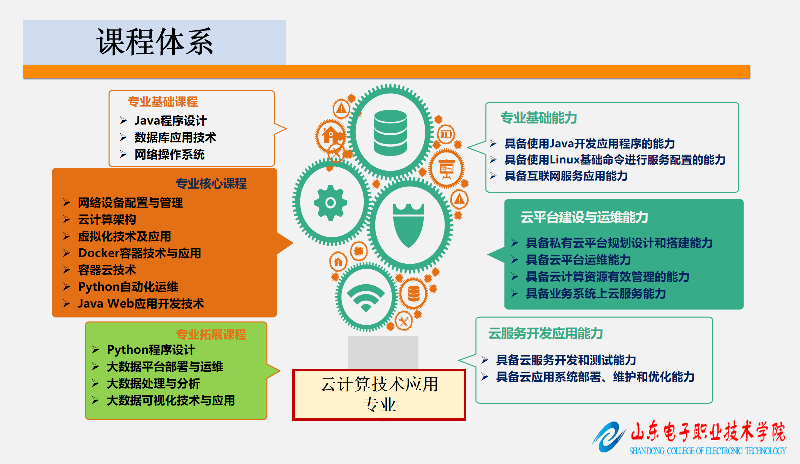 云計(jì)算技術(shù)應(yīng)用專(zhuān)業(yè)山東省教育廳立項(xiàng)高等職業(yè)教育高水平專(zhuān)業(yè)群“新興軟件與信息技術(shù)服務(wù)專(zhuān)業(yè)群”“大數(shù)據(jù)與人工智能專(zhuān)業(yè)群”骨干專(zhuān)業(yè),是山東省品牌專(zhuān)業(yè)群“軟件技術(shù)專(zhuān)業(yè)群”骨干專(zhuān)業(yè),是山東省優(yōu)質(zhì)校計(jì)算機(jī)專(zhuān)業(yè)群重點(diǎn)建設(shè)專(zhuān)業(yè)。與山東省計(jì)算中心(濟(jì)南超算中心)、國(guó)基北盛技術(shù)發(fā)展有限公司、博賽數(shù)字科技集團(tuán)有限公司等企業(yè)積極開(kāi)展合作。