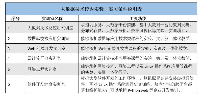 學(xué)校建設(shè)有先進的大數(shù)據(jù)相關(guān)實訓(xùn)室和實驗平臺。依托大數(shù)據(jù)應(yīng)用創(chuàng)新社,完善各項創(chuàng)新創(chuàng)業(yè)服務(wù),建立創(chuàng)新創(chuàng)業(yè)項目孵化機制;建立起依托行業(yè)優(yōu)勢、借力校企合作、立足專業(yè)建設(shè)、對接技能競賽的創(chuàng)新創(chuàng)業(yè)類特色社團和專業(yè)技能人才培養(yǎng)機制。大數(shù)據(jù)技術(shù)與應(yīng)用專業(yè)的校內(nèi)實訓(xùn)資源如下表所示: