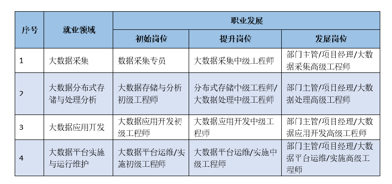 大數(shù)據(jù)技術(shù)專業(yè)畢業(yè)生主要面向IT企業(yè)、機關(guān)或企事業(yè)單位的IT部門等,從事數(shù)據(jù)采集、清洗、存儲、大數(shù)據(jù)處理分析、應(yīng)用開發(fā)和大數(shù)據(jù)平臺運維等工作。對應(yīng)的初始崗位主要有:數(shù)據(jù)采集專員,大數(shù)據(jù)處理工程師、大數(shù)據(jù)應(yīng)用開發(fā)初級工程師、大數(shù)據(jù)平臺運維初級工程師,職業(yè)發(fā)展如下表所示: