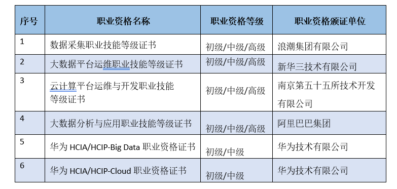 大數(shù)據(jù)技術(shù)專業(yè)對應(yīng)的職業(yè)技能等級證書或職業(yè)資格證書主要如下表所示: