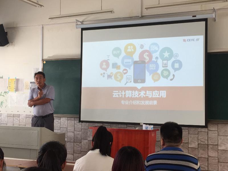 計(jì)算機(jī)系劉學(xué)主任致開場詞,他首先介紹云計(jì)算技術(shù)與應(yīng)用專業(yè)的基本情況,云計(jì)算技術(shù)與應(yīng)用專業(yè)雖然是一個(gè)新專業(yè),但之前作為軟件技術(shù)專業(yè)的一個(gè)專業(yè)方向開辦多年,學(xué)校具備良好的師資條件和教學(xué)環(huán)境,學(xué)生參加云計(jì)算技術(shù)應(yīng)用賽項(xiàng)多次在山東省職業(yè)技能大賽和全國職業(yè)技能大賽中獲獎(jiǎng)。目前我校與CETC55合作共建專業(yè),CETC55在校企合作共建云計(jì)算技術(shù)與應(yīng)用專業(yè)方面做了很多的工作,從云計(jì)算大賽到各種云項(xiàng)目的實(shí)施,都具備先進(jìn)的技術(shù)和豐富的經(jīng)驗(yàn),希望同學(xué)們?cè)趯W(xué)校和企業(yè)的共同指引下,學(xué)好云計(jì)算的專業(yè)知識(shí),創(chuàng)造一片屬于自己的天地。