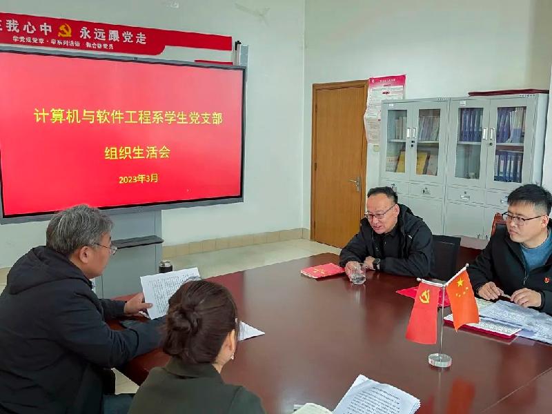 為進(jìn)一步深入學(xué)習(xí)貫徹黨的二十大精神,堅(jiān)持不懈用習(xí)近平新時(shí)代中國(guó)特色社會(huì)主義思想凝心鑄魂,3月24日,計(jì)算機(jī)與軟件工程系學(xué)生黨支部在綜合樓504 ,按要求相繼召開(kāi)組織生活會(huì)并開(kāi)展民主評(píng)議黨員。會(huì)議由支部組織委員李榮輝主持,系黨總支書(shū)記邢衛(wèi)兵、副書(shū)記劉學(xué)蒞臨現(xiàn)場(chǎng)指導(dǎo),學(xué)生黨支部全體黨員參加。