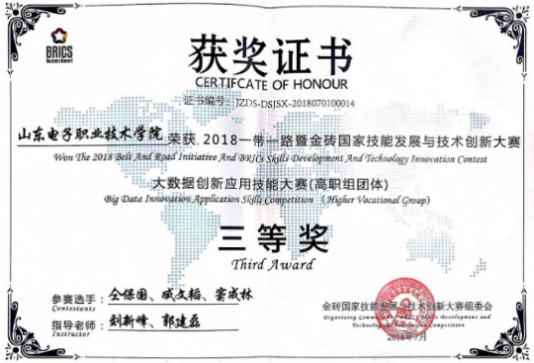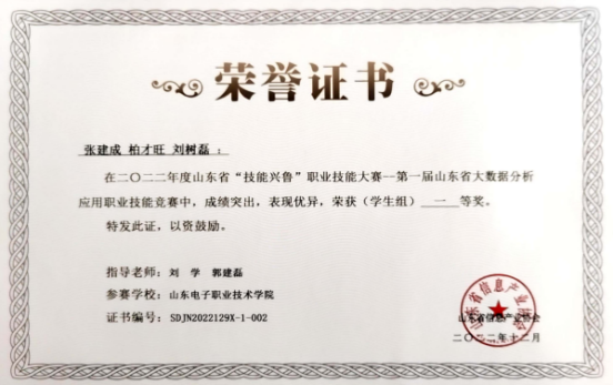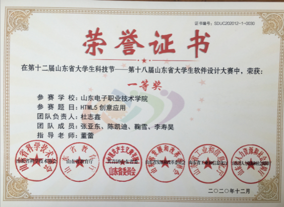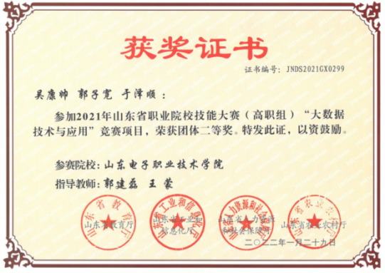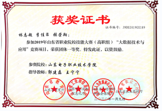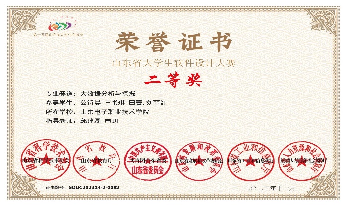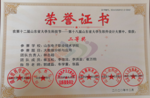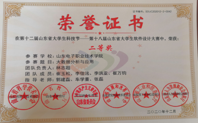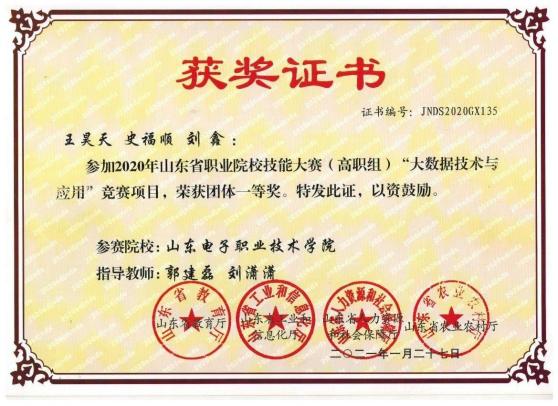 大數(shù)據(jù)應(yīng)用創(chuàng)新社注重學(xué)生創(chuàng)新創(chuàng)業(yè)技能培養(yǎng),實(shí)施專業(yè)教育和創(chuàng)新創(chuàng)業(yè)相融通的“專創(chuàng)融合”人才培養(yǎng)改革,指導(dǎo)學(xué)生參加各級(jí)各類創(chuàng)新創(chuàng)業(yè)競(jìng)賽,本專業(yè)學(xué)生在“互聯(lián)網(wǎng)+”、”挑戰(zhàn)杯“等大學(xué)生創(chuàng)新創(chuàng)業(yè)競(jìng)賽中榮獲省級(jí)及以上獎(jiǎng)項(xiàng)6項(xiàng),在山東省大學(xué)生科技節(jié)(山東省大學(xué)生軟件設(shè)計(jì)大賽)、山東省科創(chuàng)大賽等獲獎(jiǎng)20多項(xiàng),部分獲獎(jiǎng)證書(shū)如下: